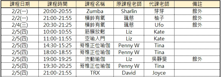 2.二月代課資訊一覽